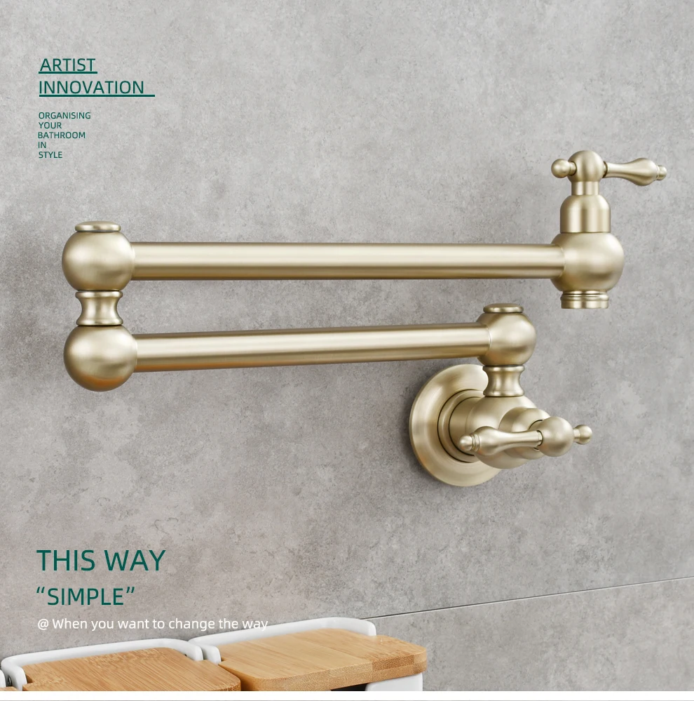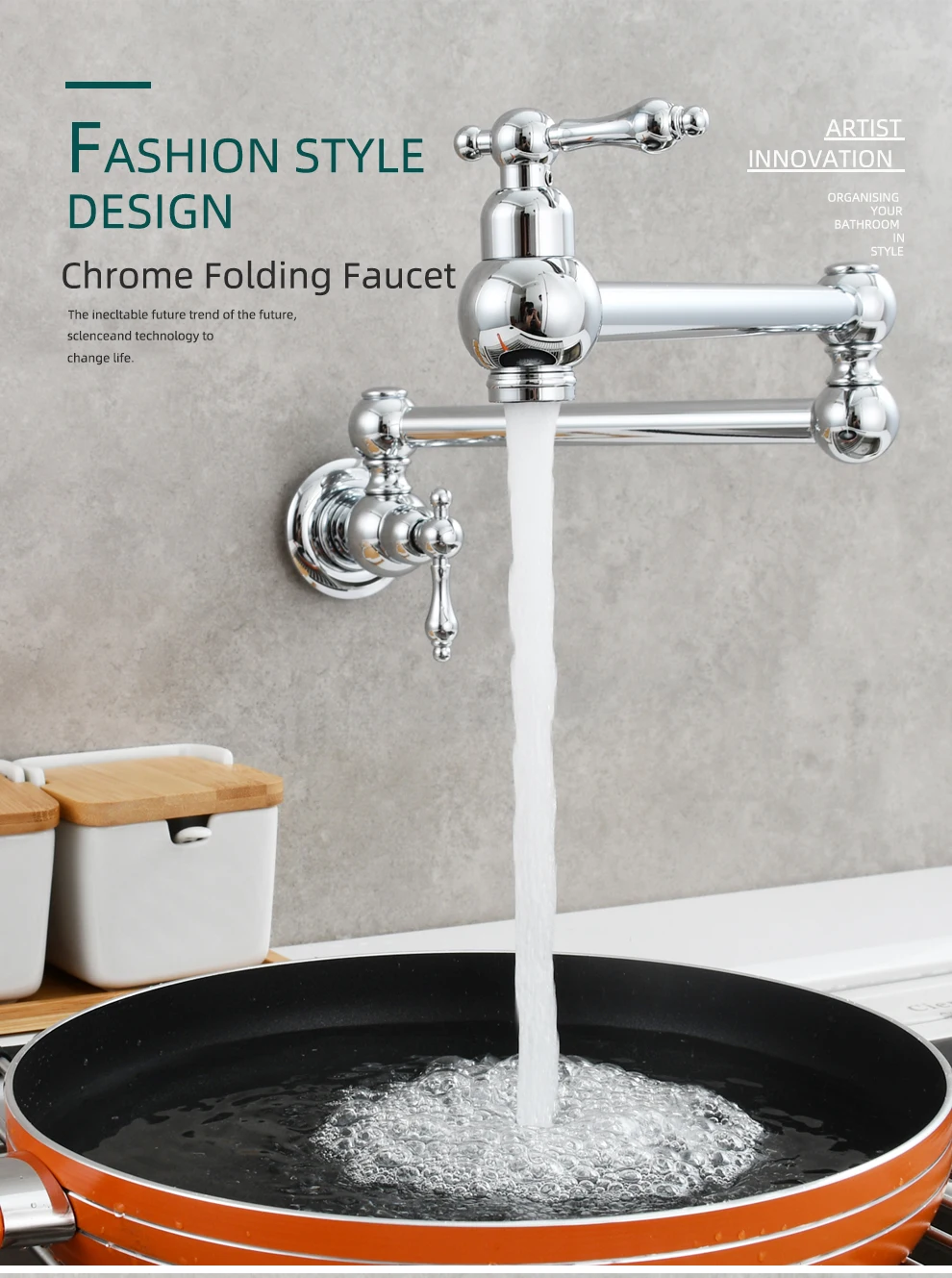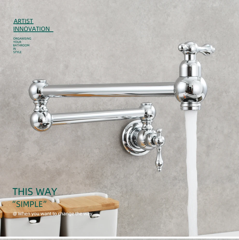 • Tecmolog Wall Mount Kitchen Faucet, 1/2”NPT Brass Folding Pot Filler Tap, Kitchen Sink Tap for Cold Water, Nickel/Black/Chrome